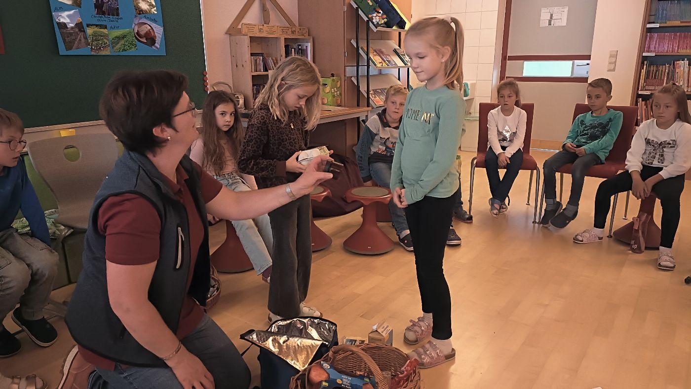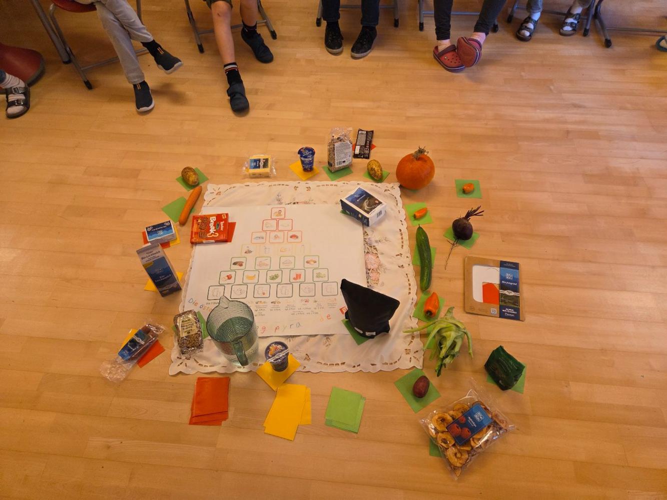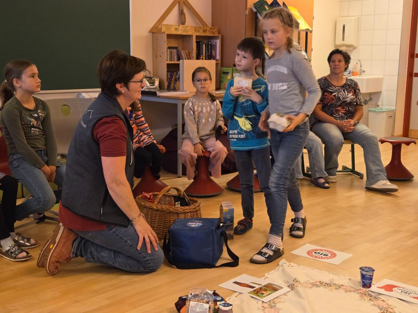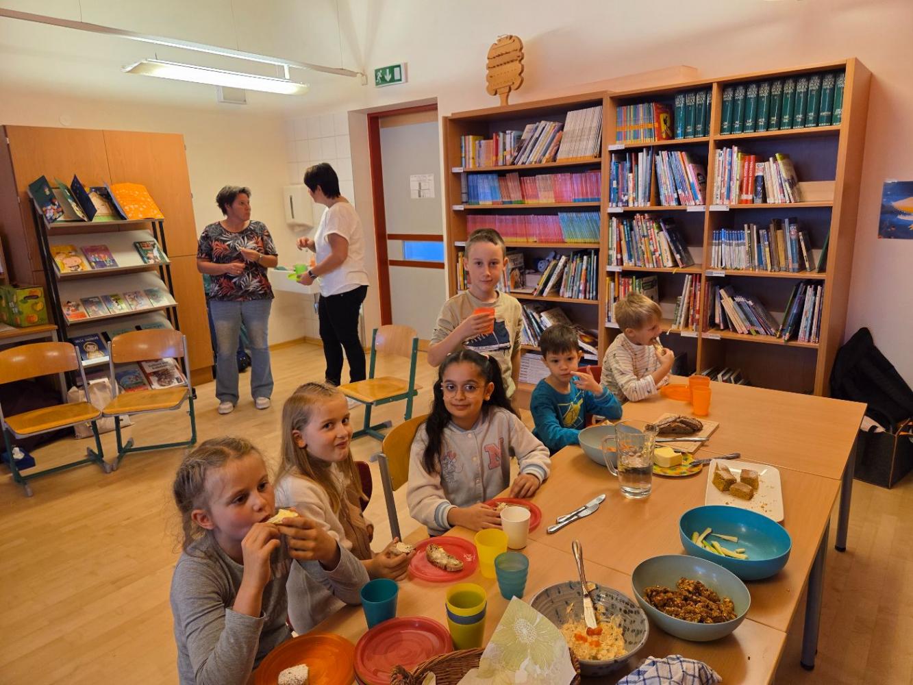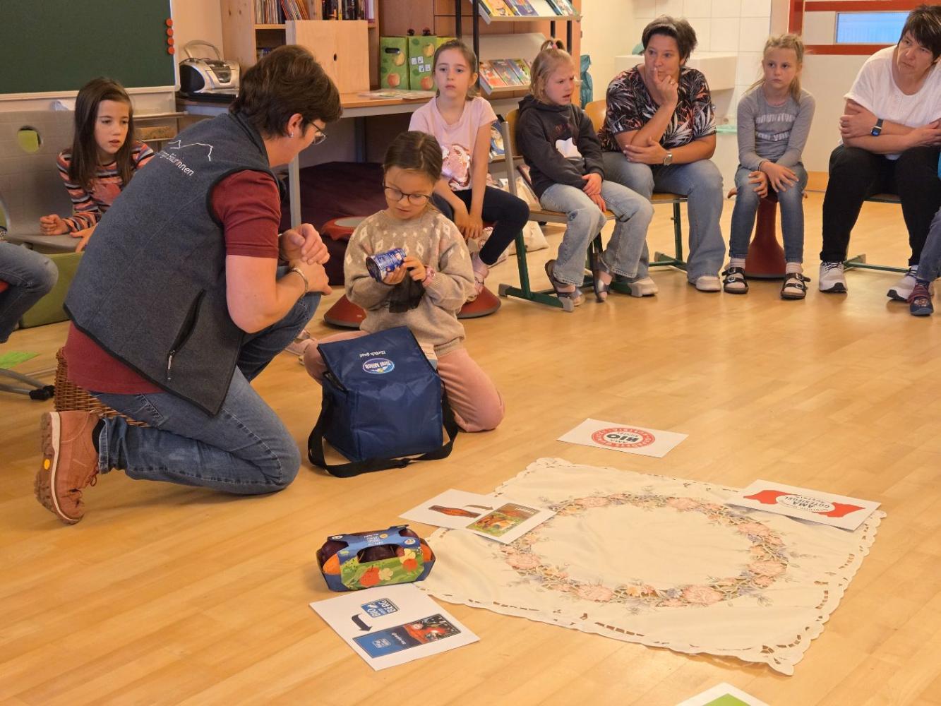 Die Ortsbäuerinnen erklärten den Kindern, wie man gesunde Lebensmittel anhand der Gütesiegel erkennt. Sie sprachen über die Ernährungspyramide und ließen die Kinder die Lebensmittel im einem Spiel ordnen nach Gesundheitsfaktor. Zum Schluss gab es noch eine köstliche Jause mit selbstgebackenem Brot, Aufstrichen, Gemüsesticks, Müslikeksen und gesunden Kuchen.