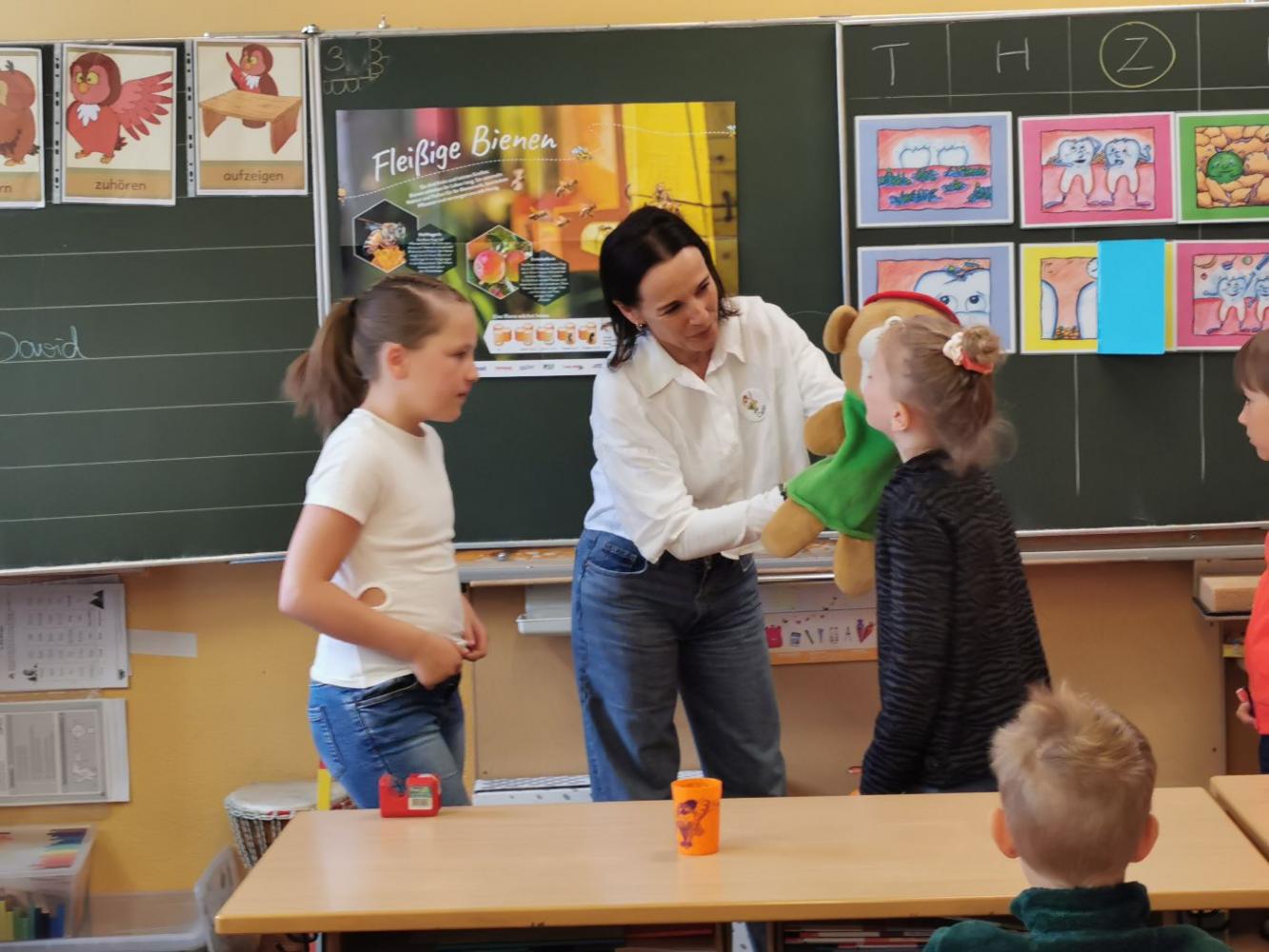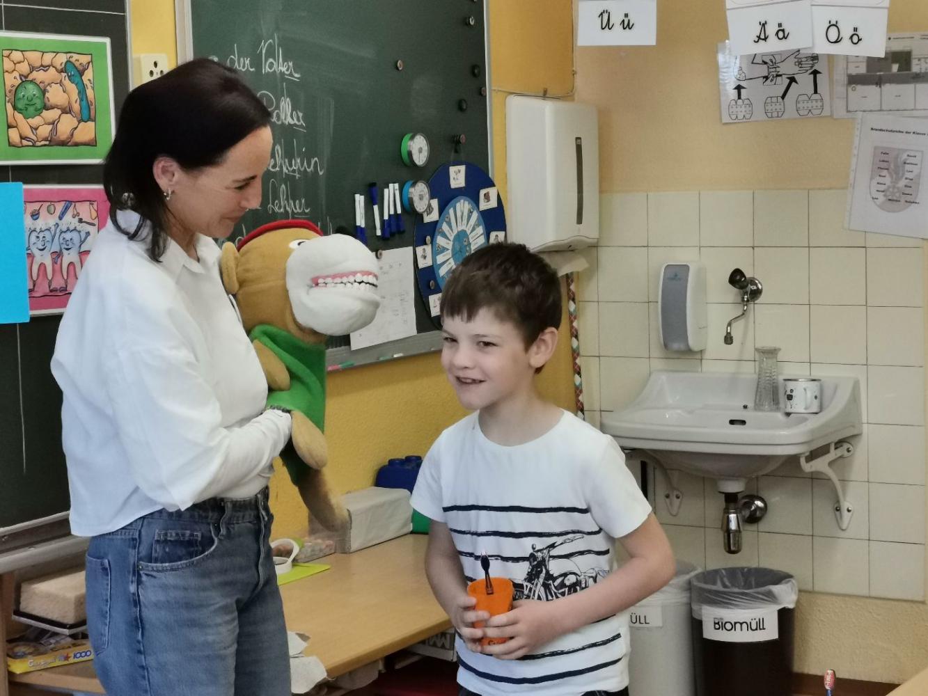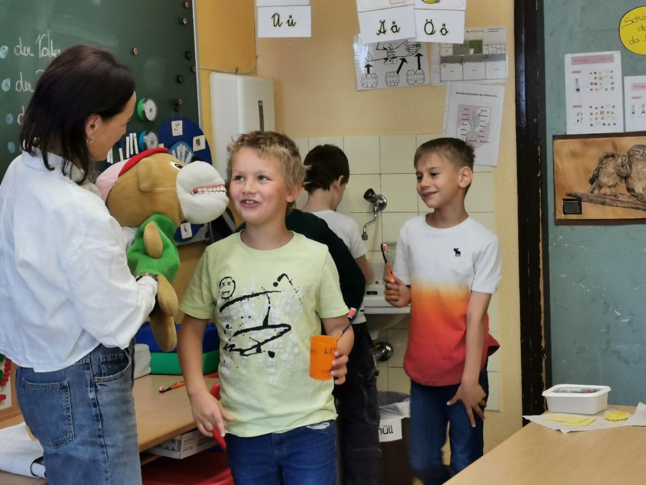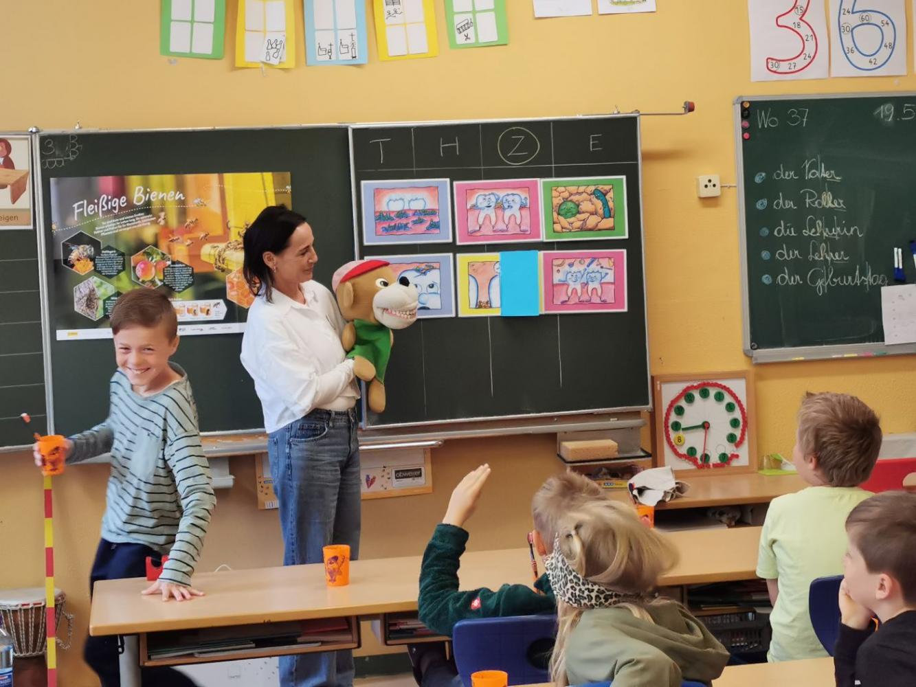Billi Bürstl hilft beim Zähneputzen von Sigrun Haidenberger 12. Juni 2025 3a „Zahngesundheit“ ist auch immer interessant und wichtig. Das Zähneputzen wird wiederholt und das Bussl vom Willi Bürstl ist natürlich der krönende Abschluss – wenn auch etwas feucht….