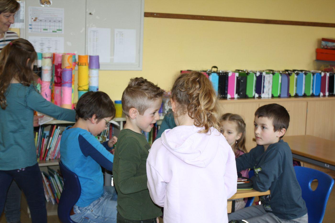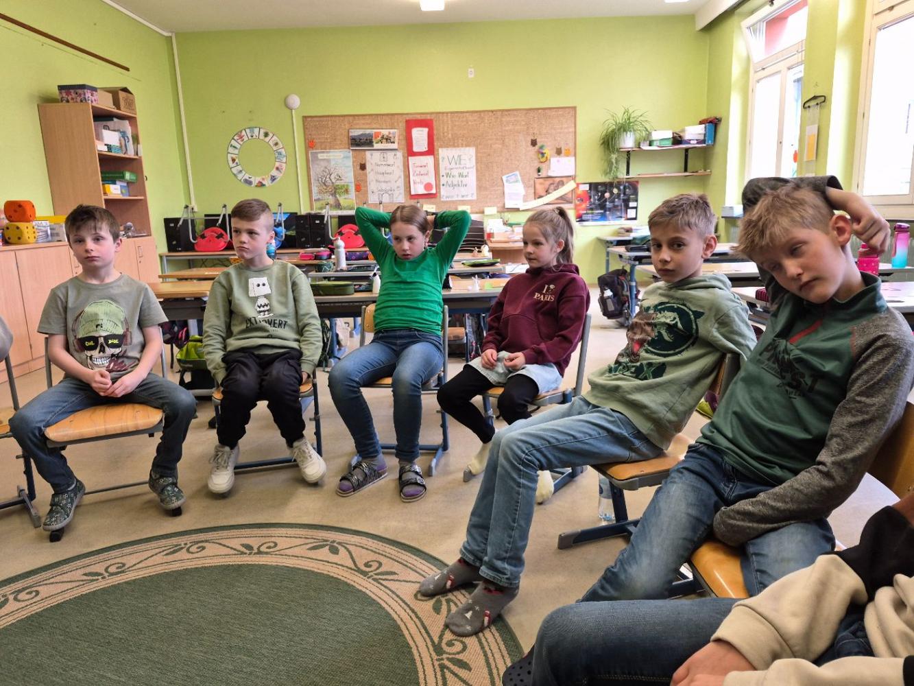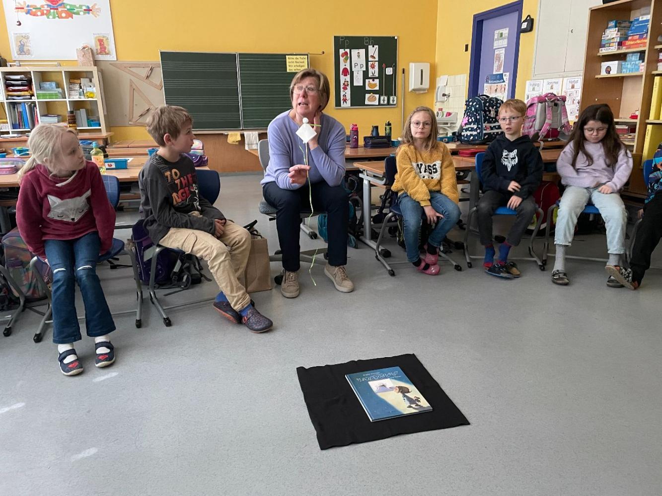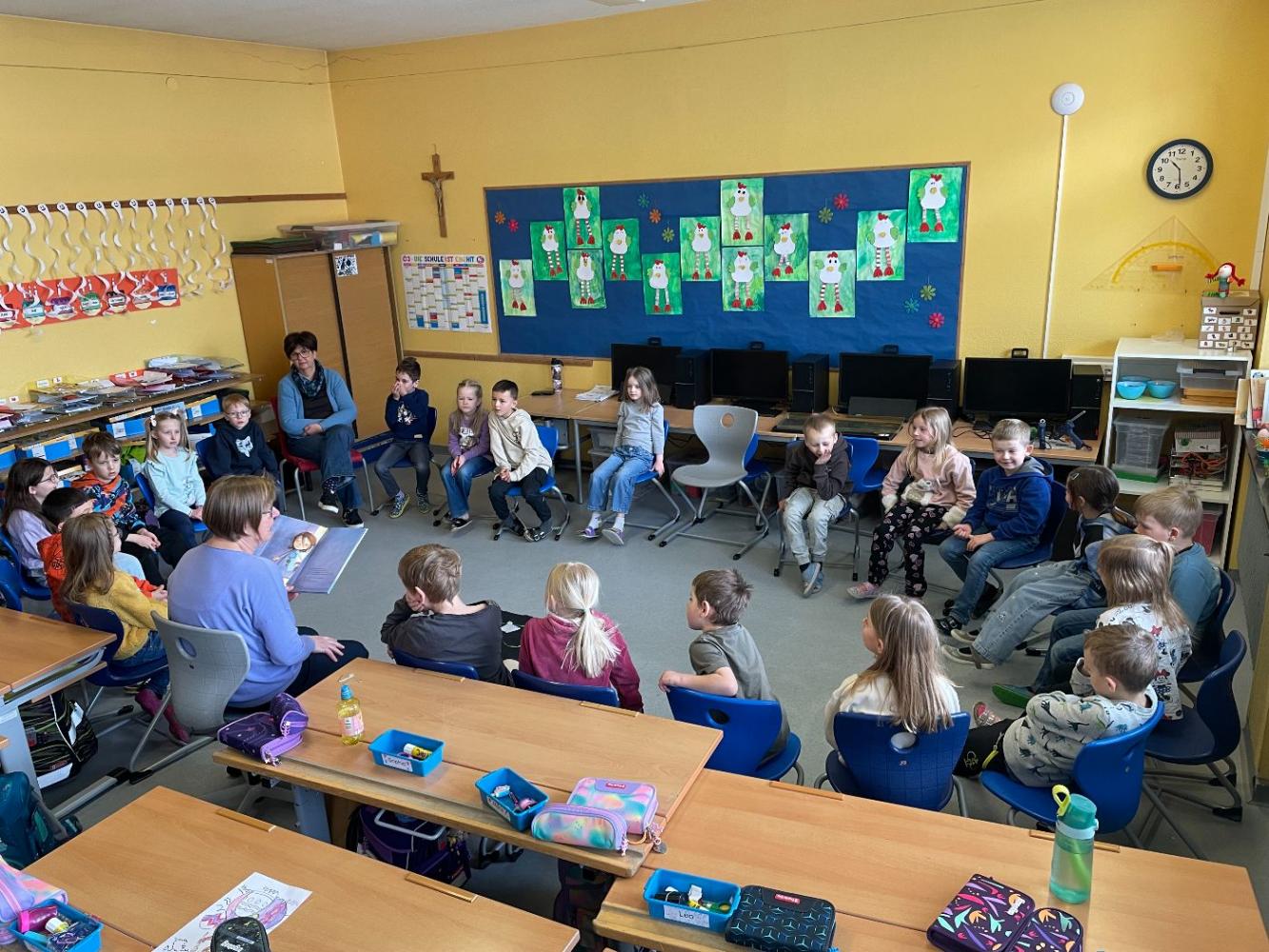 Die ehemalige Kindergartenpädagogin Genoveva Berger besuchte die 1a-Klasse und las den Kindern aus dem Buch „Das allerkleinste Nachtgespenst“ von Brigitte Weninger vor. Die Kinder wurden immer wieder durch Rätsel und kleine Spiele in die Geschichte eingebunden. Sie lauschten mit Begeisterung der erzählten Handlung und lernten eifrig den Spruch, mit dem es zumindest in der Geschichte gelingt, Nachtgespenster zu vertreiben.
