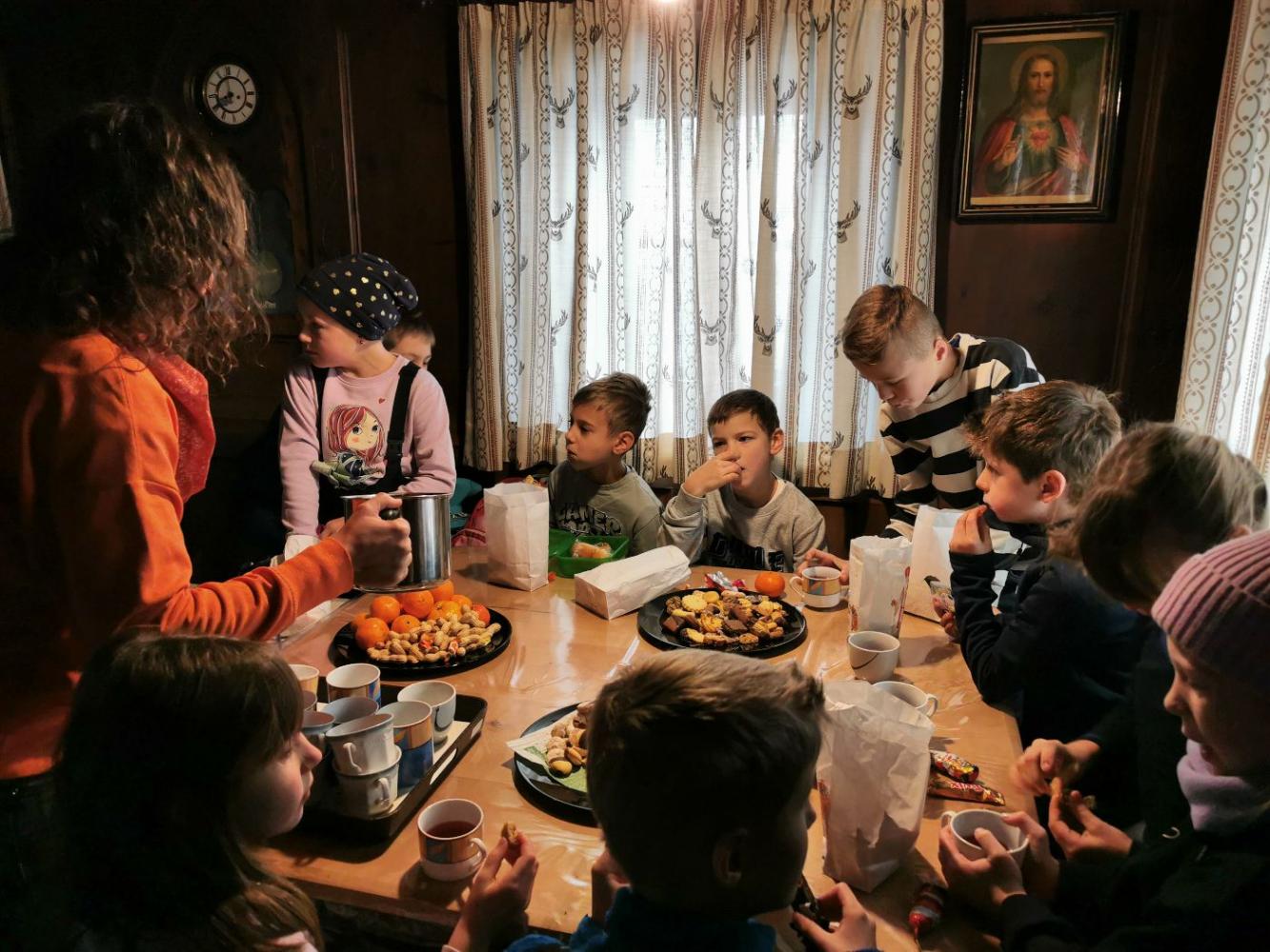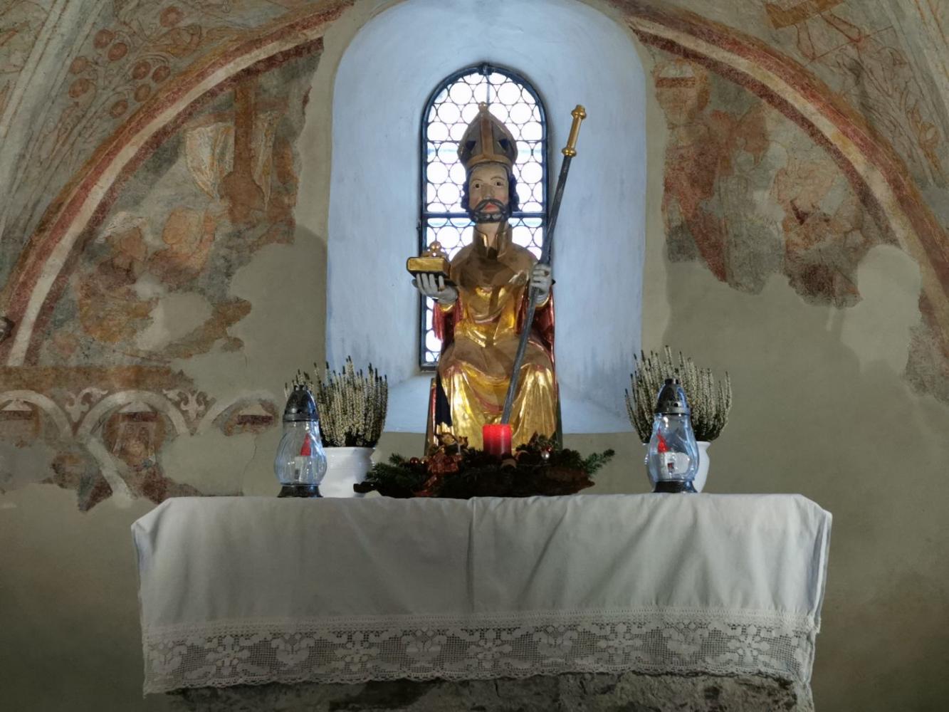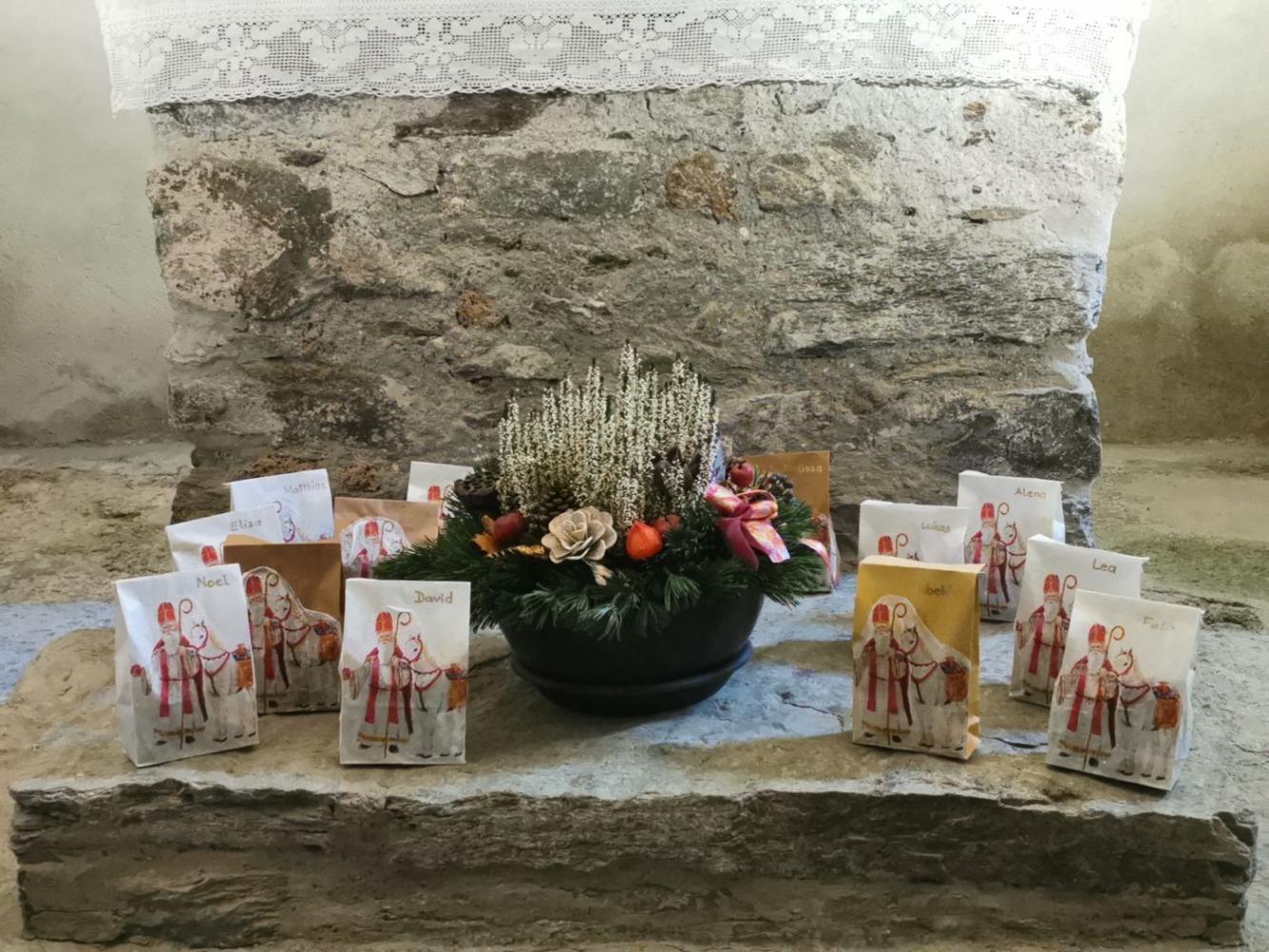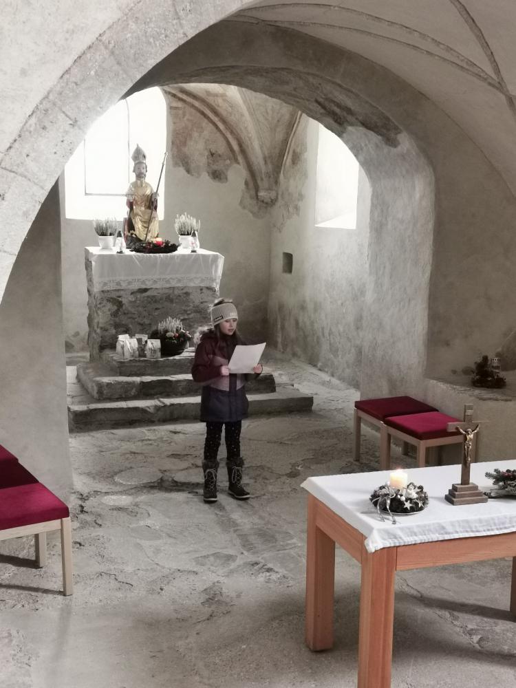 Bald kamen wir bei der Kirche an, die hinter leichtem Nebelschleier verhüllt war. Dort lasen wir, beteten und sangen. Wir entdeckten auch unsere Nikolaussäckchen. So eine Überraschung!!