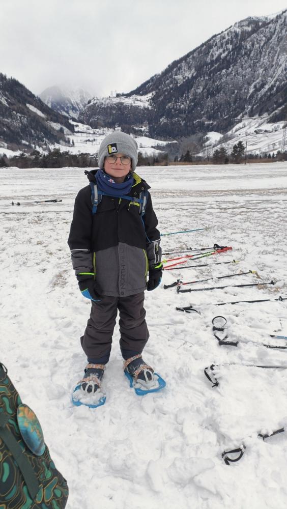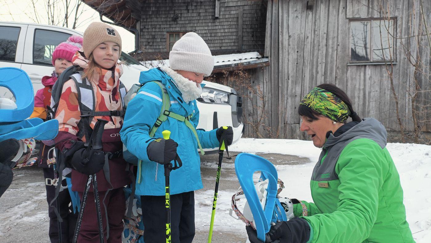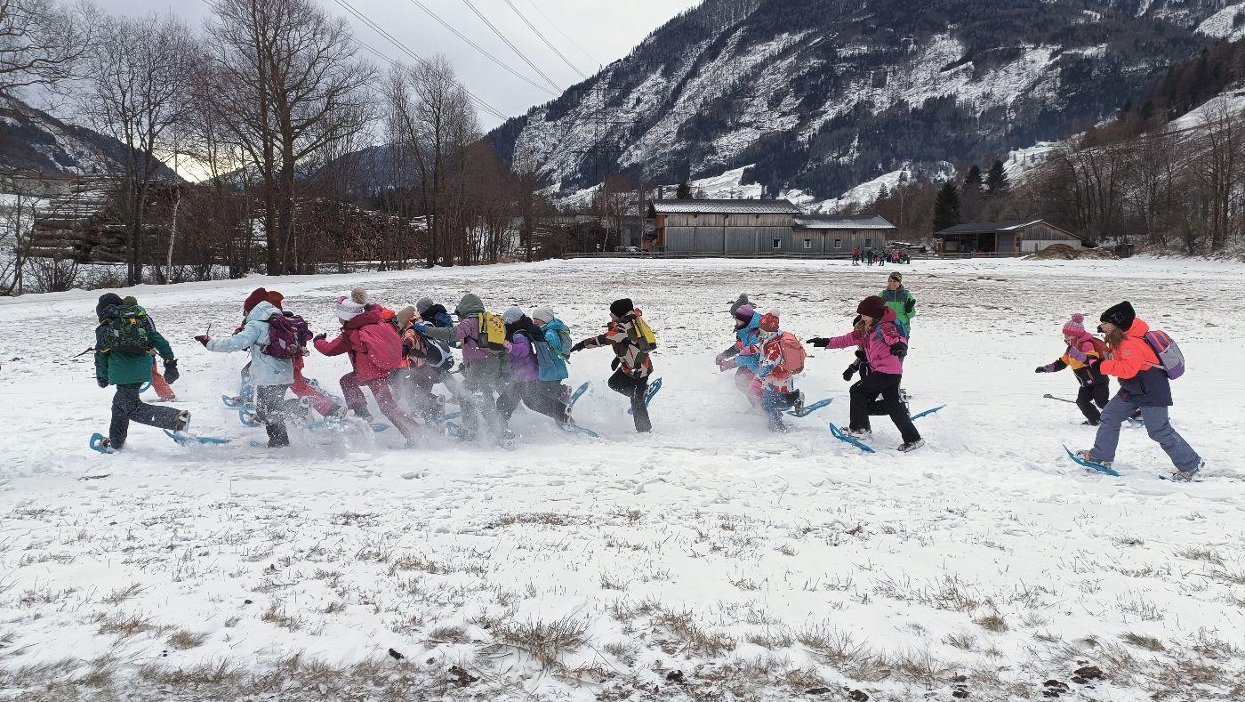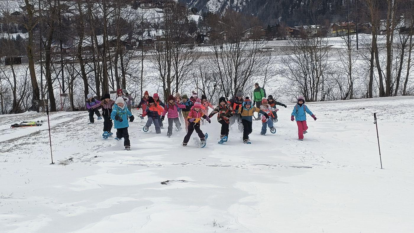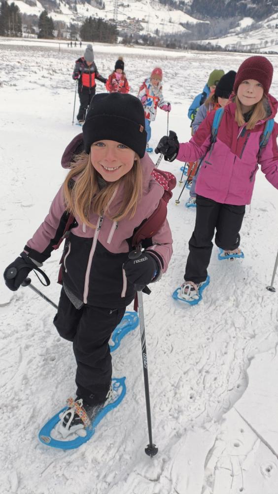 Die Kinder der zweiten Klassen durften mit den Nationalparkrangerinnen Carola, Maria und Sophie das Schneeschuhwandern kennen lernen. Leider war am Wochenende der Wind sehr stark und hat den Schnee zum Teil verweht. Carola, Maria und Sophie wussten jedoch noch gute Plätze und starteten mit uns beim Kreuzbichel eine kleine Wanderung über Schneewege. Die Kinder lernten Hasenspuren kennen und machten auch selbst welche in den Schnee. Beim Damm machten wir eine Rast und danach auch einige lustige Spiele: "Fuchs und Hase", "Eichhörchnchenspiel"...